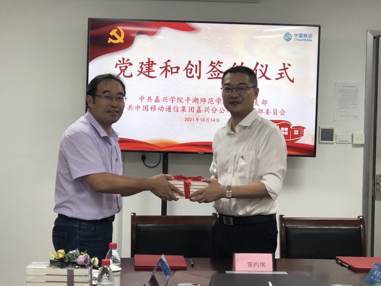 10月15日下午,学院综合党支部、中国移动平湖分公司党支部在平湖移动公司党员活动室开展校地党建共同体暨“党建和创”协议书签约活动,打造共建共享的党建工作新格局。学院党委书记朱素斌、院长李勇、副书记冯伟芳,中国移动平湖分公司党支部书记、总经理高翔,支部委员、副总经理周铁健、朱乐君等出席签约活动。