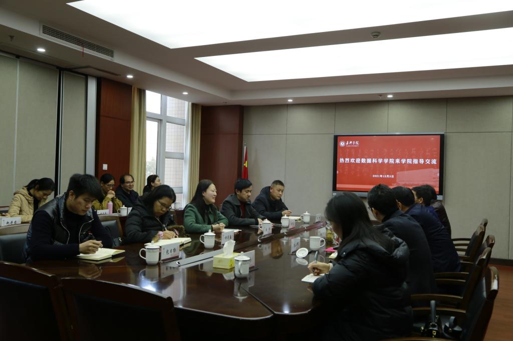 12月3日下午,数据科学学院党委书记战昕一行到学院调研交流。学院党委书记朱素斌、党委副书记冯伟芳,党委委员、副院长、艺术教研部教工党支部书记朱小烽、综合党支部书记陆火根、党政办主任卓海丹等相关人员参加了交流会。
