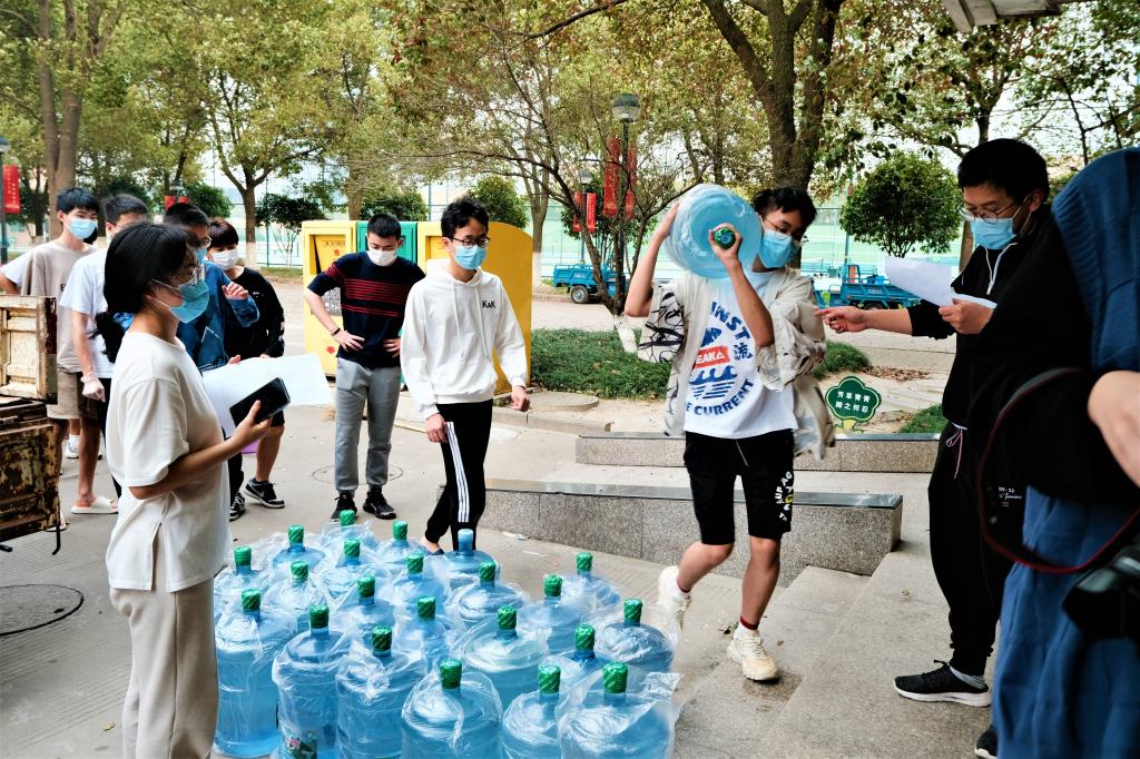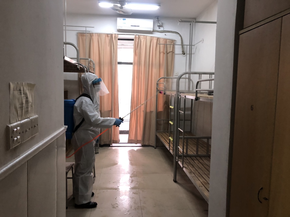 从晨光熹微到暮色四合,后勤服务中心、后期服务有限公司工作人员夜以继日、兢兢业业奋战在学校的各个角落。校园保洁、楼宇消杀、物资发放等等,他们为每个健康观察寝室配备饮水机,配送桶装水,让物尽其用、物暖人心。即使每天席地而睡,他们也面带微笑,不辞辛劳。