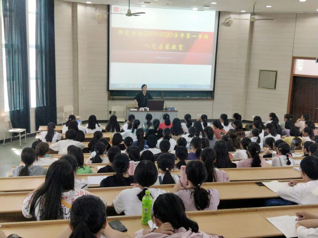 9月25日12时30分, 2019—2020学年第一学期入党启蒙教育在阶梯教室一顺利开展。师范学院团总支专职副书记钟张懿老师主讲,共有276名入党申请人参加。