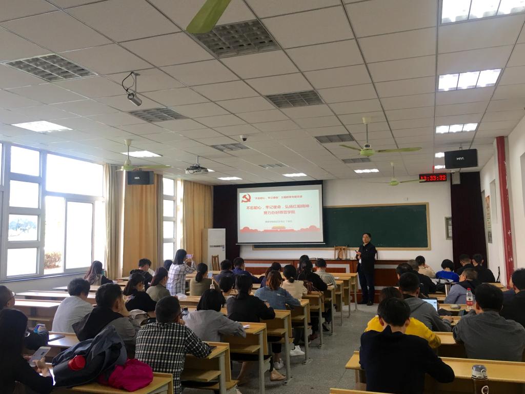 10月31日下午,学院党总支书记、院长丁连生以《“不忘初心、牢记使命”,弘扬红船精神,办好师范学院》为题,为全院师生党员讲了一堂生动的专题党课,激励党员同志要从我做起,从身边做起,从现在做起,守住合格的底线,瞄准优秀的高线,培养造就铁一般的信仰、铁一般的信念、铁一般的纪律和铁一般担当的党员干部队伍,用全心全意为人民服务的工作来诠释一名共产党员的初心和使命。