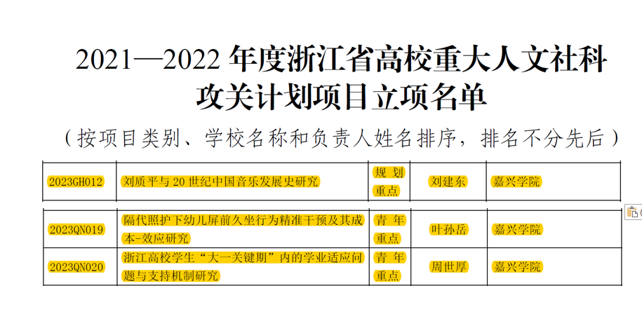 日前,浙江省教育厅办公室发文公布了2021—2022年度浙江省高校重大人文社科攻关计划项目,学院3项课题喜获立项,其中规划重点项目1项,青年重点项目2项。