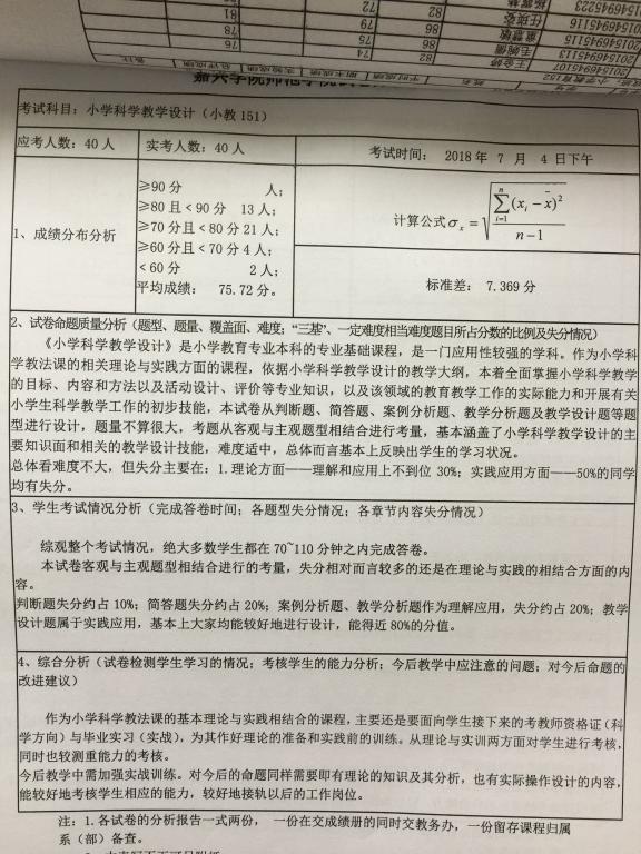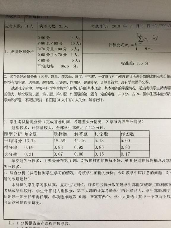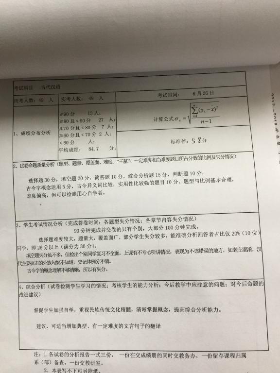 附件3有几位老师的试卷分析报告,可供参考。授课计划及教学日志等一些材料在教务办,但是为了预防有些试卷缺少材料,还是需要老师们重新整理一下,尤其是学位课程及主干课程,课堂教学大纲如果中间没有变化,可以不提供,如果大纲有变化则需注明并提供。