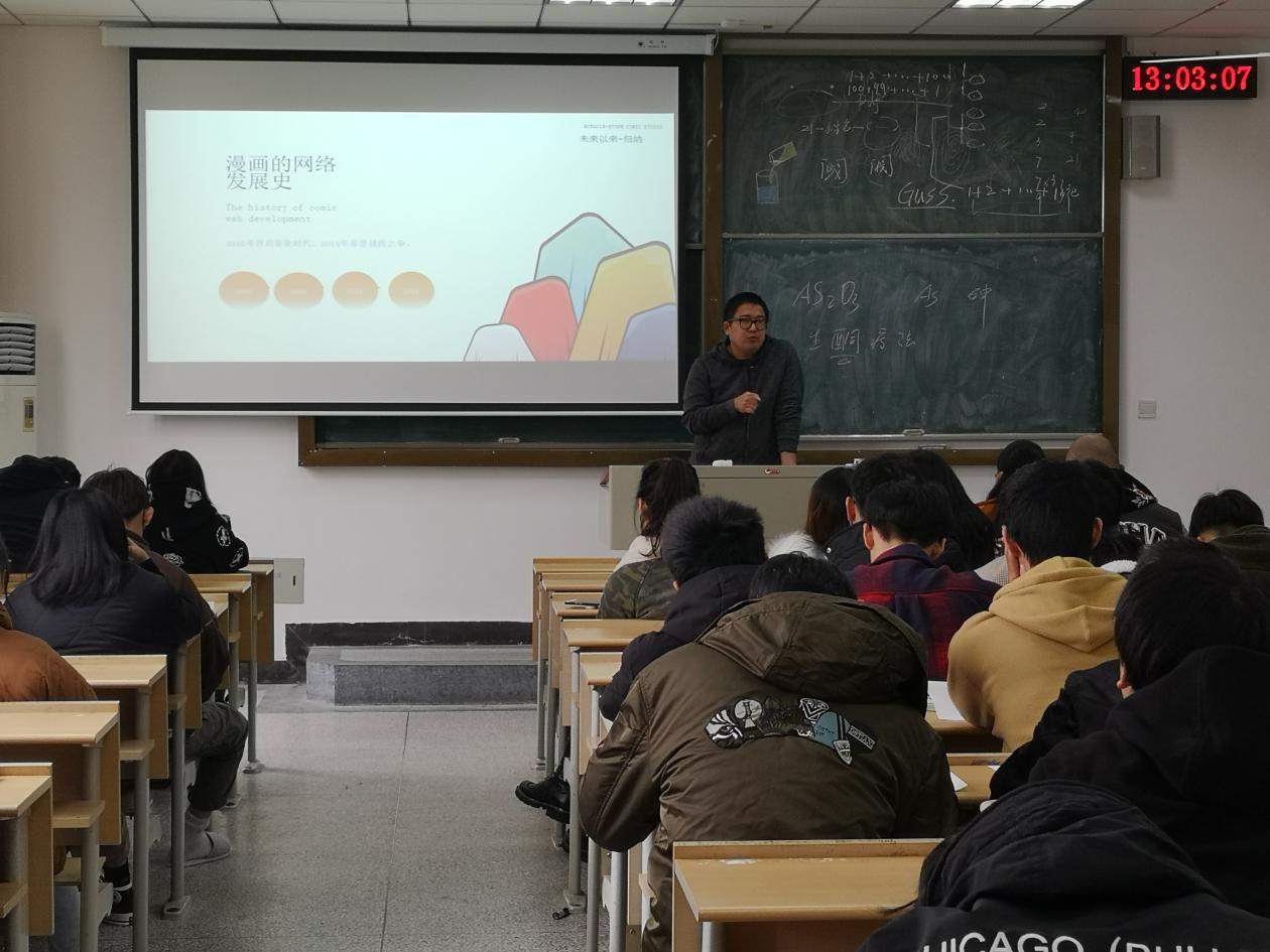 2018年12月13日下午,我院数媒系在明德楼多媒体教室五召开16级实习动员会议暨实习单位宣讲活动。数媒系主任邵瑜莲老师,陈建新、黄蒙水、张倩、黄胜红等老师,北京华语盛世影视公司总经理何梦新先生与杭州点染网络科技有限公司合伙人、教育总监刘柱先生以及数媒系19届全体学生参加会议。