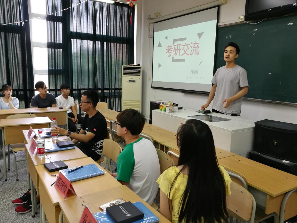 6月7日下午,学院邀请商学院工商131班周聪、经济132班孟于超,师范学院学前教育131班范智毅、学前教育132班秦秀丽四位同学与物流管理141班36位同学作考研专题交流。