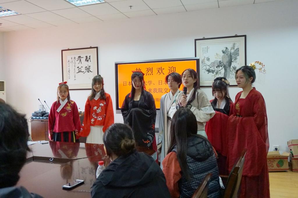 交流会上,同学们以小组的形式就专业学习、大学生活等展开交流。学院学生社团汉服社精心准备的歌舞和对汉服详细的介绍,动漫社社员的舞蹈引起了日本游学生对汉服和中国文化的兴趣。现场,日本游学生为大家带来了中文歌曲《我等到花儿也谢了》,赢得了同学们的热烈掌声。