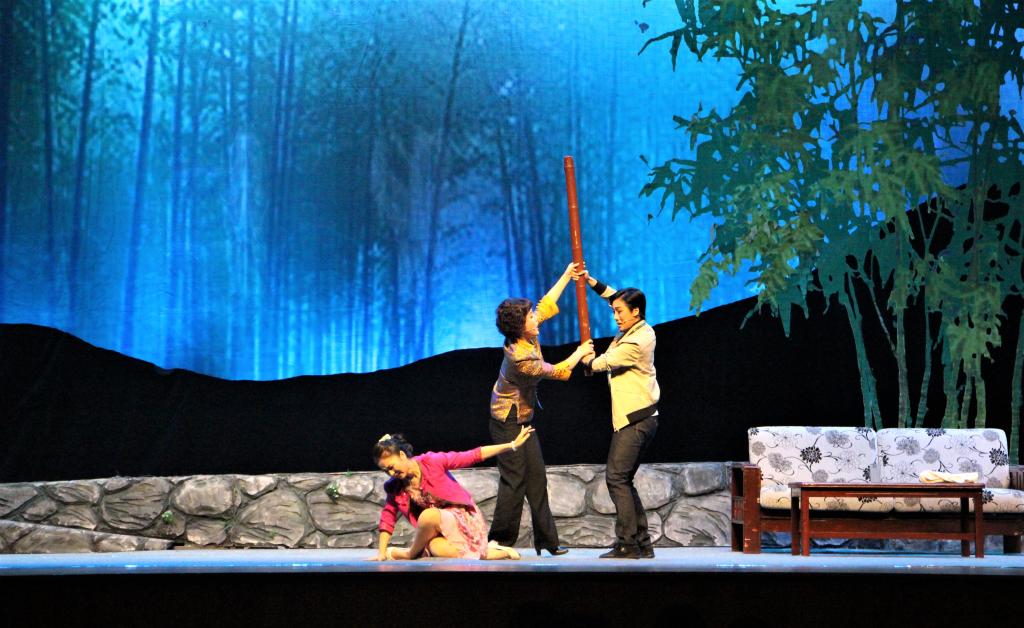 现代题材越剧《德清嫂》以德清县道德模范蒋引娣、封丽娟等人为故事原型人物,讲述了一位善良的农家大嫂抚养一对孤儿的动人故事。整场演出极具情节性,演员们将优美的语言腔调与夸张的肢体动作相配合对每个场景进行了极为生动的描述,通过细腻的表演将观众带入情境中,引发了观众的共鸣。
