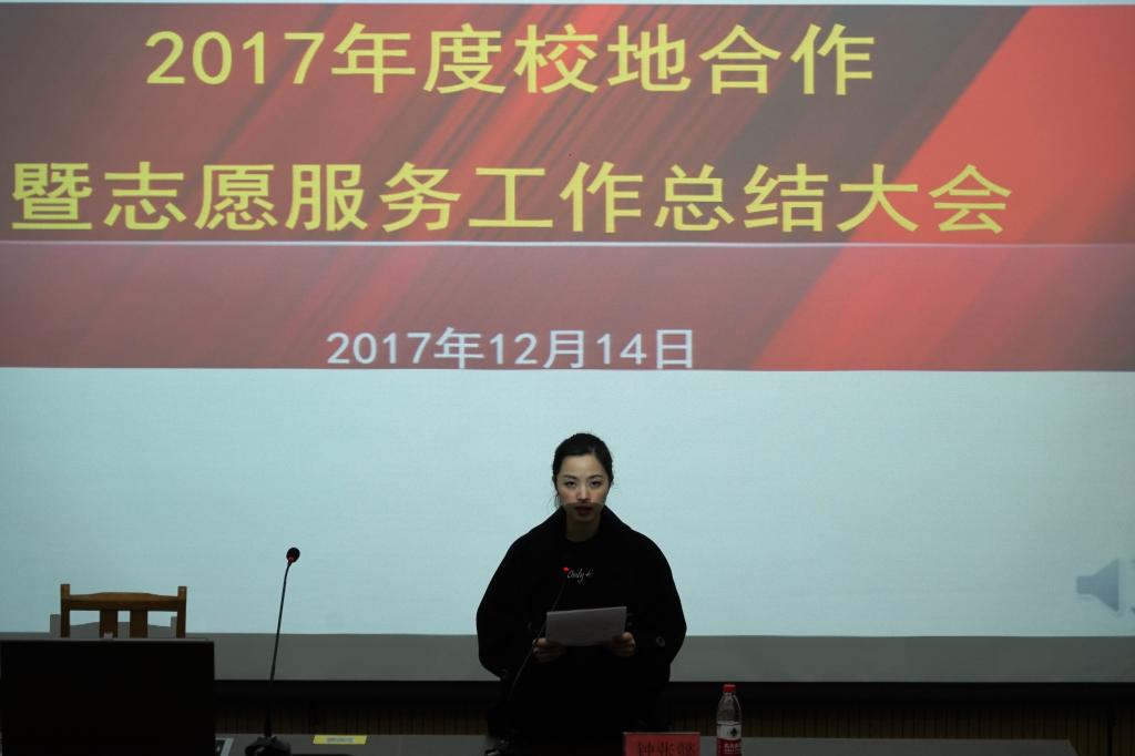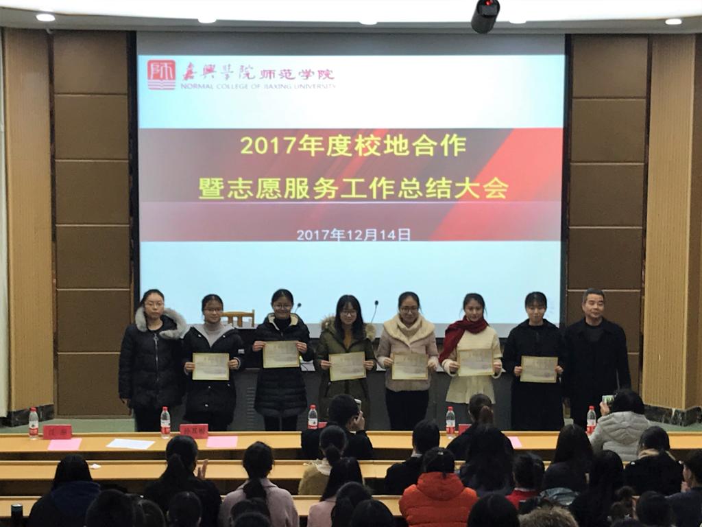 12月14日下午,师范学院2017年度校地合作暨志愿服务工作总结大会在阶梯教室三顺利举行。平湖市经济技术开发区(钟埭街道)团工委副书记王冕、钟埭社区党委书记孙其根、永兴社区党委副书记叶晓燕、花园社区团支部书记沈琳、新群社区代表许丽应邀出席了本次会议。师范学院志愿服务团队全体成员、12.5志愿日志愿服务周“最美志愿者”、2016年度志愿服务先进个人、各班班长、团支书参加会议。