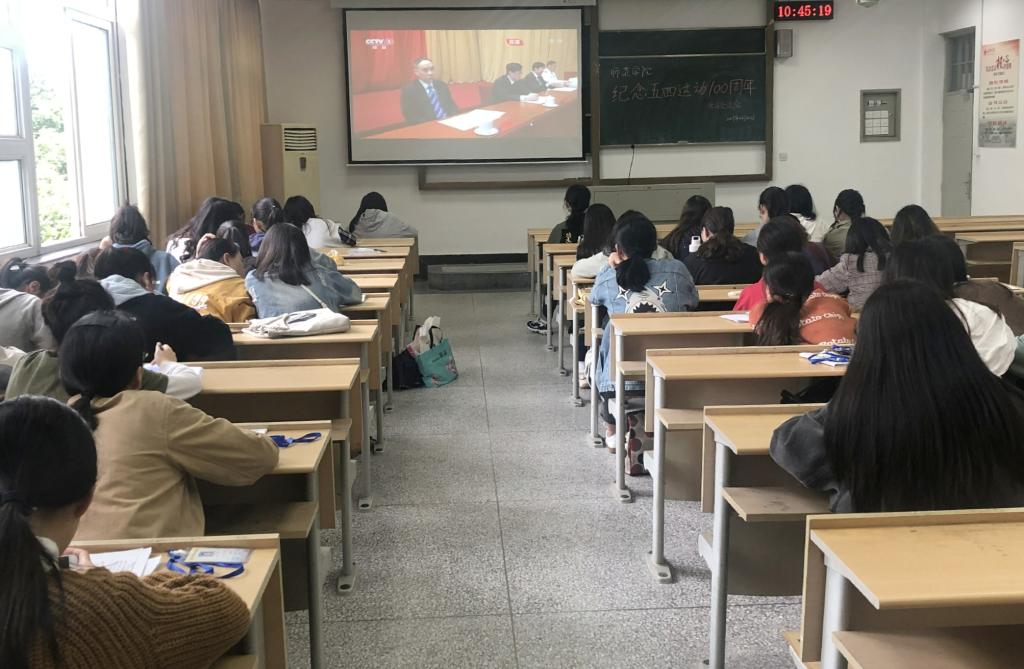 2019年4月30日上午10:30,师范学院组织师生观看《纪念五四运动100周年大会》直播。学院书记丁连生、副书记毕洪东及部分教师在行政楼314会议室观看,学生在多媒体教室六观看并进行学习交流会。