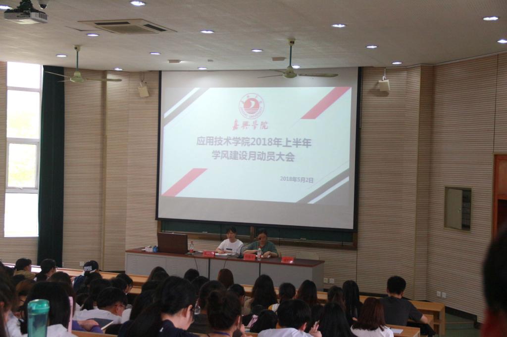 5月2日中午,应用技术学院2018年上半年学风建设月动员大会在阶梯教室一召开。学院学工办主任、团总支书记卓海丹、各班级近300名学生参加。学院辅导员朱薇婷主持。
