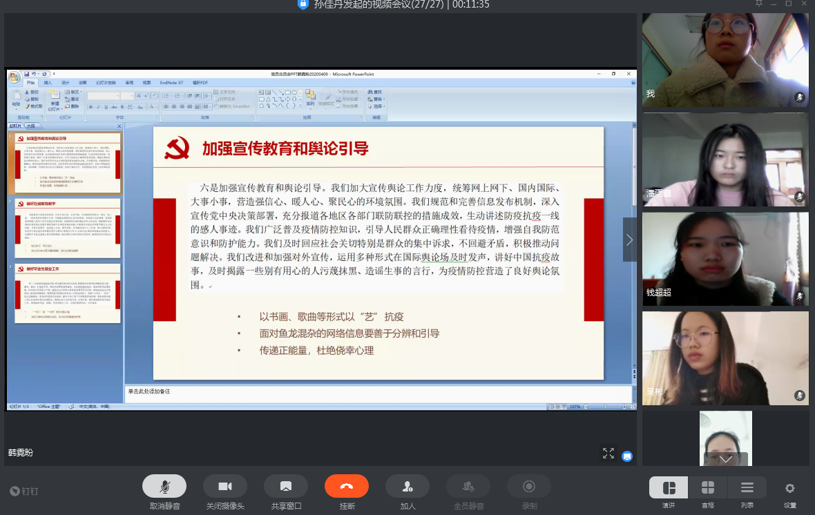首先,每一位学生党员学习了习近平总书记《在统筹推进新冠肺炎疫情防控和经济社会发展工作部署会议上的讲话》和《中共教育部党组关于统筹做好教育系统新冠肺炎疫情防控和教育改革发展工作的通知》,并通过PPT的形式分享了学习心得和体会。学生党员分别结合实际从宣传教育、舆论引导、在线教育教学等多方面进行阐述,提出疫情下要充分发挥学生党员的先锋模范作用,体现党员的责任担当。