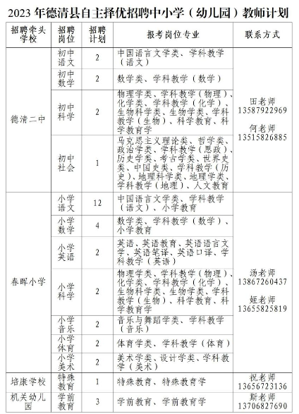 户籍不限!2023年浙江省德清县中小学(幼儿园)教师招聘公告