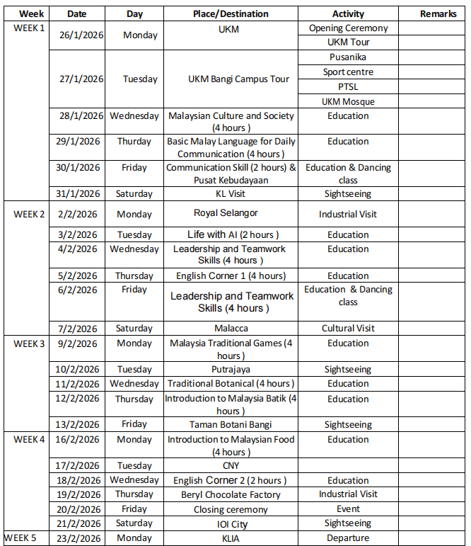 【住宿】 全程居住在UKM校内的学生公寓(双人间)。