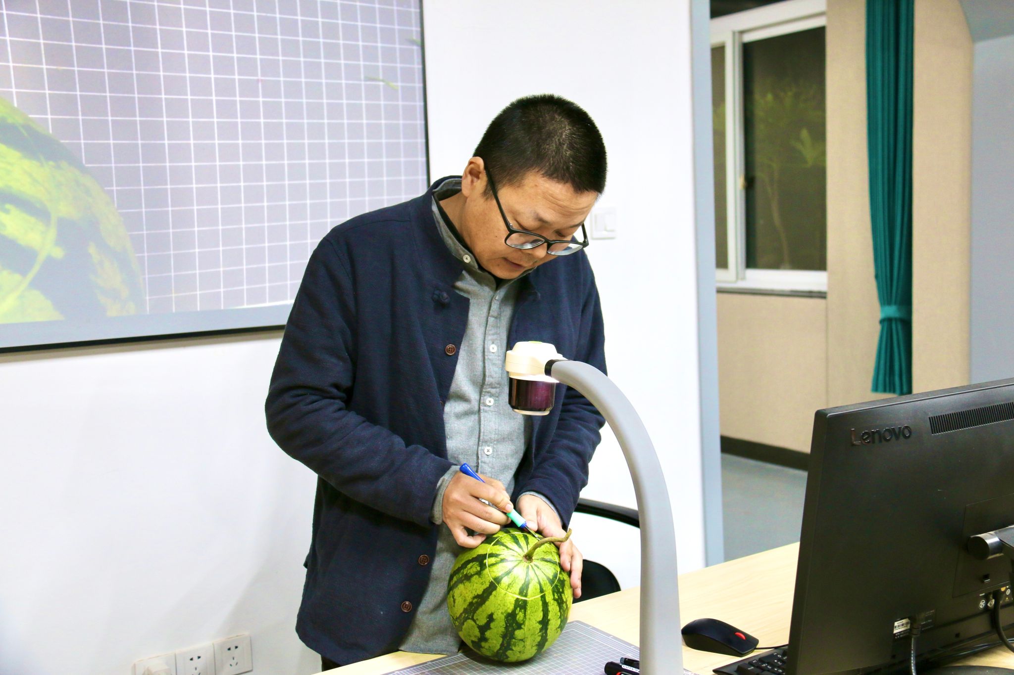 学生代表姜欢上台进行操作,他提到“还是实践难度大于理论,雕刻西瓜还需要反复练习”。学生们自主设计心目中的西瓜灯外观,并展开分享讨论。