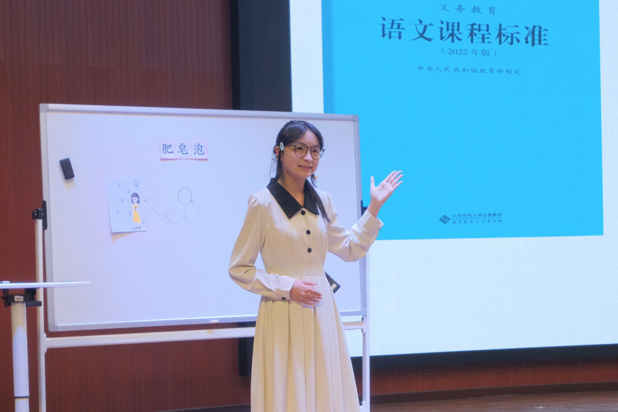第二个环节中,写意花鸟画与毛笔书法共展笔墨神韵,引得师生们定睛欣赏、低声赞叹;《海岬春瓮》朗诵用文字浸润文学意境,带领全场观众沉浸于文字构筑的诗意世界;《肥皂泡》说课环节更是将活动推向创新实践的高潮,通过系统阐释新颖的教学理念与实践方法,充分展现了我院师范生的创新教学理念。