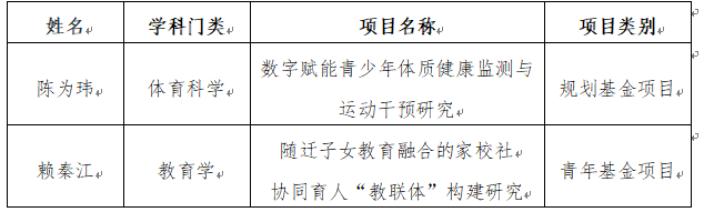 此次项目的成功立项,既是对两位青年教师学术素养、研究能力与项目设计价值的认可,同时又是聚焦“数字赋能与青少年体质健康”、“随迁子女教育融合与协同育人” 等前沿议题,为学院在体育科学、教育学相关领域的研究拓展了新方向、开辟了新赛道,有利于进一步提升学院在人文社会科学领域的学术影响力。