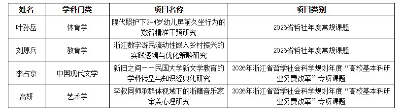 近日,浙江省哲学社会科学规划2026年度常规项目、三类研究专项立项名单公布,学院共有4项课题成功立项,涵盖体育学、教育学、中国现代文学与艺术学等多个学科领域。